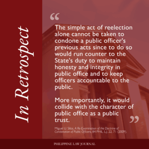 [4] Miguel U. Silos, A Re-Examination of the Doctrine of Condonation of Public Officers, 84 Phil. L.J. 22, 56 (2009).