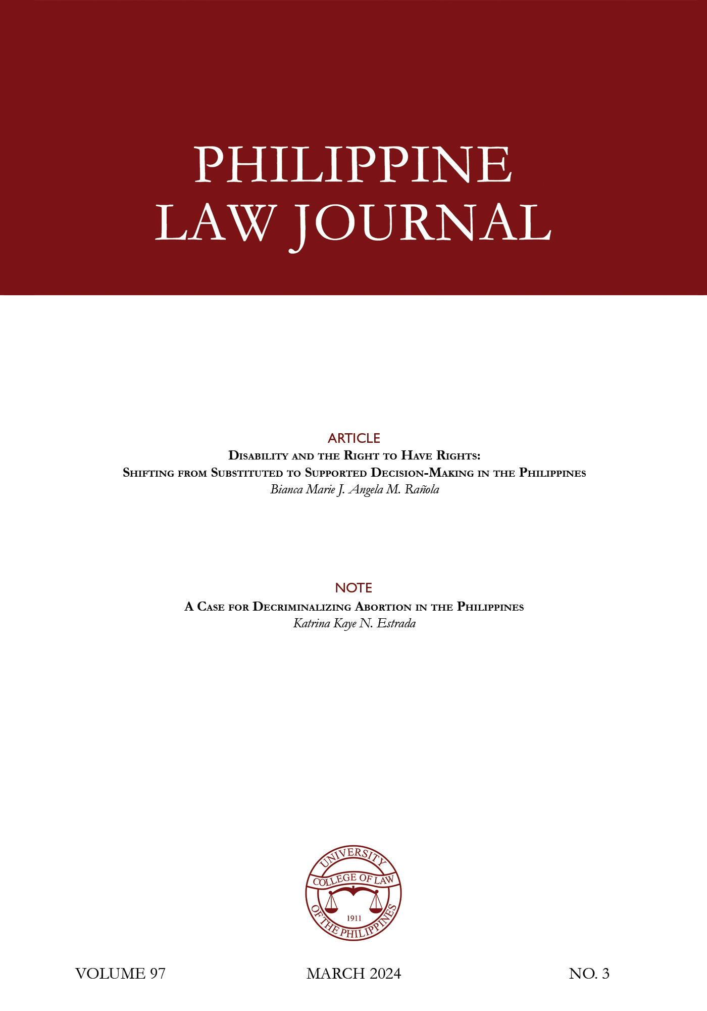 Volume 97 | Issue 3 • Mar 2024 Contents Authors Links Disability and the Right to Have Rights: Shifting from Substituted to Supported Decision-Making in the Philippines Rañola, Bianca Marie J. Angela M. Download A Case for Decriminalizing Abortion in the Philippines Estrada, Katrina Kaye N. Download